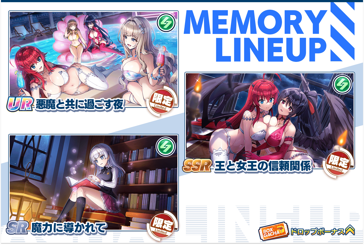 ※メモリーのステータスにつきましては、「ハイスクールD×Dコラボドルフィンフェスガチャ」の「ピックアップ詳細」よりご確認ください。