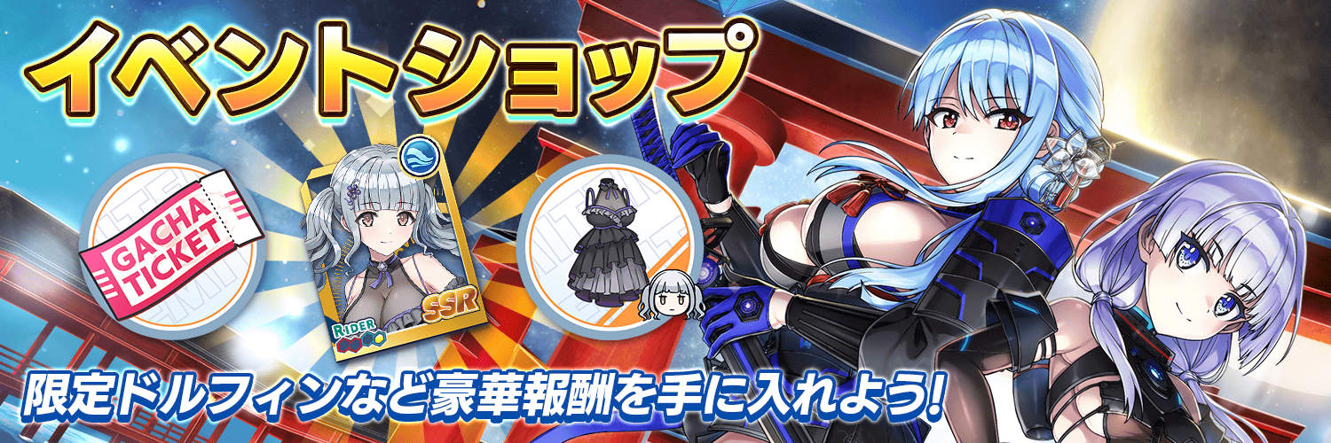 期間限定ショップでは、イベント限定ドルフィン「長土 萌依(アシンメトリードレス)」やドルフィン育成素材等、様々なアイテムが登場!